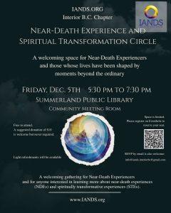 The IANDS Interior BC Chapter offers a warm, safe, and compassionate space for Near-Death Experiencers (NDErs), people who have had spiritually transformative experiences (STEs), and anyone who feels called to learn from these profound moments. Our gatherings are grounded in respect, lived experience, and gentle community connection.